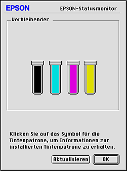 Sie können dieses Utility auch verwenden, um den Tintenstand vor dem Drucken zu überprüfen. Wenn der EPSON StatusMonitor geöffnet ist, zeigt er den Status der verbleibenden Tintenmenge zum Zeitpunkt des Öffnens an. Um die Tintenstandinformationen zu aktualisieren, klicken Sie auf Aktualisieren.