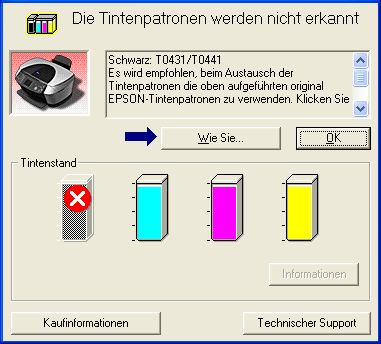 Wenn eine Tintenpatrone fast oder völlig leer ist, erscheint die Schaltfläche Wie Sie unter dem Textfeld. Klicken Sie auf Wie Sie..., dann gibt der EPSON StatusMonitor 3 Ihnen Schritt-für -Schritt-Anweisungen zum Austauschen der Tintenpatrone.