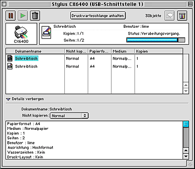 Nachdem Sie einen Druckauftrag an dieses Gerät übertragen haben, können Sie den EPSON Monitor IV zur Steuerung, zum Abbrechen und zum Ändern der Priorität der Druckaufträge in der Druckerwarteschlange verwenden. Dieses Utility zeigt darüber hinaus den Status des aktuellen Druckauftrags.