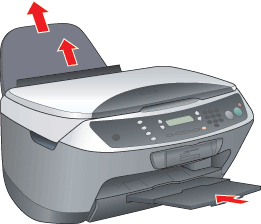 Entfernen Sie die Papierstütze und die Papierfach-Schutzblende. Schieben Sie die Papierausgabefach-Verlängerung in das Gerät.