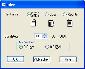 Wählen Sie cm oder Zoll als Einstellung für Maßeinheit aus. Legen Sie dann die Breite des Bindungsrands fest. Sie können eine beliebige Breite zwischen 3 und 30 mm bzw. 0,12 und 1,18 Zoll eingeben.