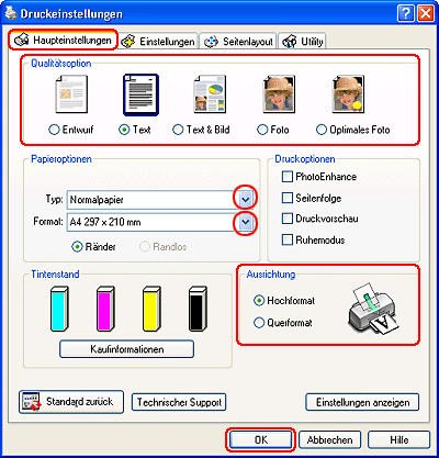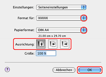 Wählen Sie die geeignete Einstellung für Papierformat und Ausrichtung aus. Sie können auch ein eigenes Papierformat definieren. Nähere Informationen hierzu finden Sie in der Online-Hilfe.