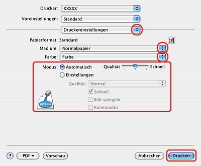 Wählen Sie die entsprechenden Einstellungen für Medium, Farbe und Modus aus. Weitere Informationen zu den Druckereinstellungen finden Sie in der Online-Hilfe.