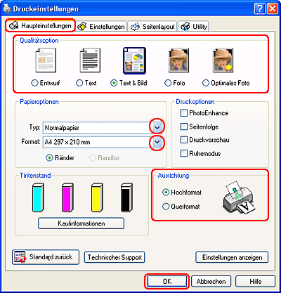 Wählen Sie die geeignete Einstellung für Papierformat und Ausrichtung aus. Sie können auch ein eigenes Papierformat definieren. Nähere Informationen hierzu finden Sie in der Online-Hilfe.