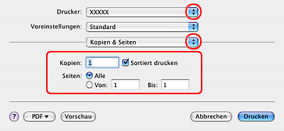 Wählen Sie in Drucker den verwendeten Drucker aus. Stellen Sie dann die Kopien und Seiten ein.