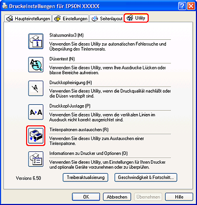 Wenn Sie eine Tintenpatrone austauschen müssen, bevor sie verbraucht ist, klicken Sie auf die Schaltfläche Austausch der Tintenpatrone auf der Registerkarte Maintenance.