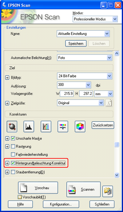 Standard Modus:Klicken Sie das Kontrollkästchen Hintergrundbeleuchtung-Korrektur an.