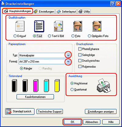 Wählen Sie die geeigneten Einstellungen für Papiergröße und Ausrichtung aus. Sie können auch ein eigenes Papierformat definieren. Nähere Informationen finden Sie in der Online-Hilfe.