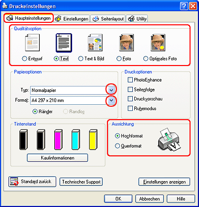 Wählen Sie zwischen Hochformat (senkrecht) und Querformat (waagerecht) für die Ausrichtung des Ausdrucks aus.