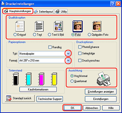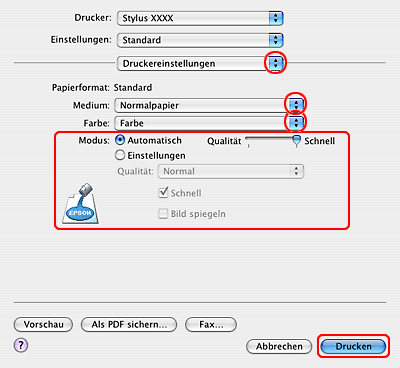 Wählen Sie die entsprechenden Einstellungen für Medium, Farbe und Modus aus. Einzelheiten zu den Druckeinstellungen finden Sie in der Online-Hilfe.