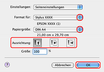 Wählen Sie die geeigneten Einstellungen für Papiergröße und Ausrichtung. Sie können auch ein eigenes Papierformat definieren. Nähere Informationen finden Sie in der Online-Hilfe.