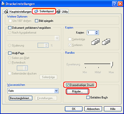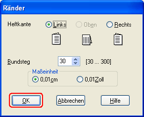 Der tatsächliche Bindungsrand kann abhängig von der Anwendung von den vorgegebenen Einstellungen abweichen. Drucken Sie einige Testseiten aus, bevor Sie den gesamten Druckauftrag starten.