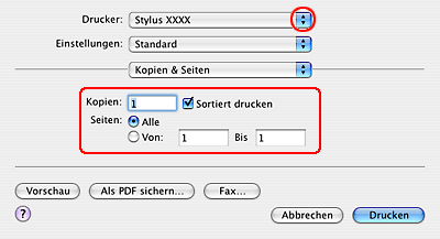 Wählen Sie die Druckereinstellung, die zu dem Format passt, das Sie in Schritt 2 ausgewählt haben. Wählen Sie dann die Einstellungen für Kopien & Seiten.