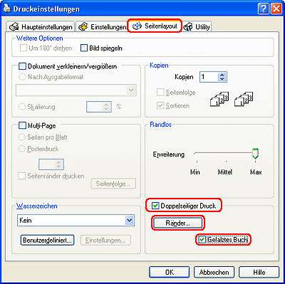 Der tatsächliche Bindungsrand kann abhängig von der Anwendung von den vorgegebenen Einstellungen abweichen. Drucken Sie einige Testseiten aus, bevor Sie den gesamten Druckauftrag starten.