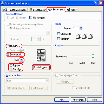 Die Einstellung Randlos für Posterdruck ist unter Windows Me und 98 SE nicht verfügbar.