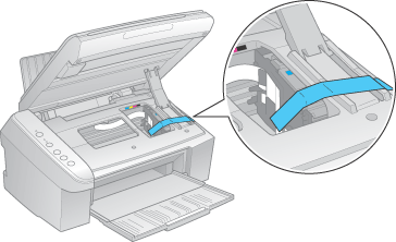 Sichern Sie die Tintenpatronenhalterung wie abgebildet mit Klebeband am Gehäuse und schließen Sie dann die Scannereinheit.