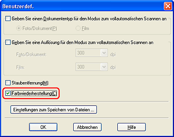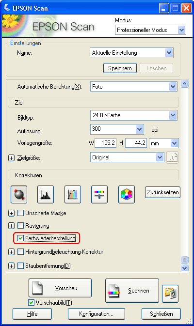 Befolgen Sie diese Schritte, um die Farben mit Epson Scan wiederherzustellen.