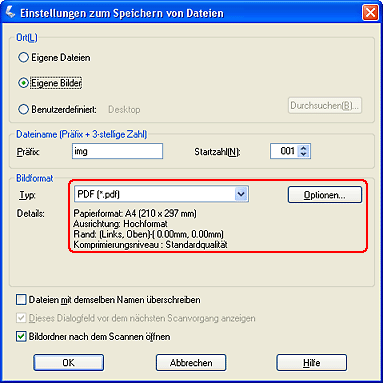 Wählen Sie die Einstellungen, die zu Ihrem Dokument passen, und klicken Sie auf OK. Sie kehren in das Fenster "Einstellungen zum Speichern von Dateien" zurück.