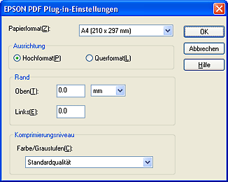 Wenn Sie eine der aktuellen PDF-Einstellungen ändern müssen, klicken Sie auf die Schaltfläche Optionen. Das Fenster "Epson PDF Plug-in-Einstellungen" wird angezeigt.