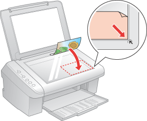 Legen Sie das Dokument oder Foto auf die Vorlagenablage, so dass die Vorderseite nach unten auf das Glas zeigt. Richten Sie die obere Kante des Dokuments oder Fotos an der unteren rechten Ecke des Vorlagenglases aus.