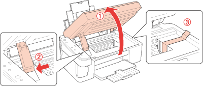 Öffnen Sie die Druckerabdeckung. Sichern Sie den Druckkopf mit einem Klebeband (siehe Abbildung unten).