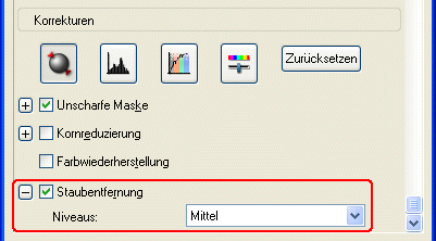 Aktivieren Sie das Kontrollkästchen Staubentfernung. (Möglicherweise müssen Sie im Dialogfeld ganz nach unten scrollen.)