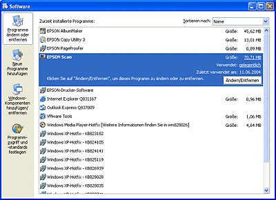 ![]() | Wählen Sie EPSON Scan aus der Liste aus und klicken Sie auf Ändern/Entfernen (Windows XP und 2000) bzw. Hinzufügen/Entfernen (Windows Me und 98). |