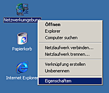 Klicken Sie mit der rechtem Maustaste auf das Symbol Netzwerkumgebung und wählen Sie Eigenschaften aus.