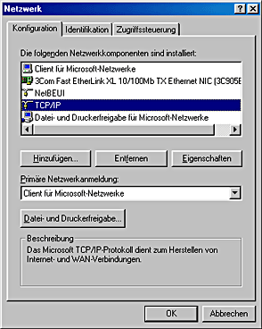 Vergewissern Sie sich, dass das TCP/IP-Protokoll und die folgenden Netzwerkkomponenten installiert und im Listenfeld enthalten sind: