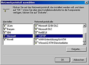 Wählen Sie Microsoft im Feld Hersteller und TCP/IP aus Netzwerkprotokolle aus und klicken Sie auf OK.