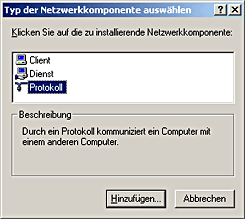 Klicken Sie auf Installieren. Das Dialogfeld Typ der Netzwerkkomponente auswählen wird angezeigt.