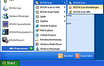 Klicken Sie auf Start, zeigen Sie auf Alle Programme (Windows XP) bzw. Programme (Windows Me, 98, 2000 und NT 4.0) und EPSON Scan und klicken Sie dann auf EPSON Scan.