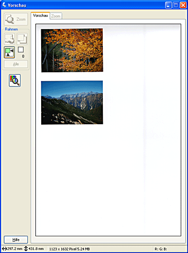 Mit dem normalen Vorschauverfahren werden das gesamte Vorschaubild und die Auswirkungen Ihrer Einstellungen angezeigt, und Sie können weitere Bildeinstellungen vornehmen. Außerdem können Sie Rahmen verwenden, um ausgewählte Bereiche eines Bildes zu scannen. Nähere Informationen zu Rahmen erhalten Sie unter Rahmen verwenden.