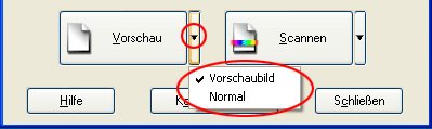Durch Klicken auf Vorschau wird der Vorschauscan gestartet und das Bild in der Vorschau angezeigt. Abhängig vom Modus und der eingestellten Vorlagenart erscheint ein kleiner Pfeil rechts neben der Schaltfläche Vorschau, über den Sie ein Vorschauverfahren auswählen können. Klicken Sie auf den Pfeil und wählen Sie die Vorschau oder Normalaus, um zu einem anderen Vorschauverfahren zu wechseln.