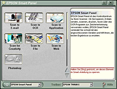 Wählen Sie eine Anwendung aus dem Listenfeld EPSON Smart Panel oder klicken Sie unten links auf die Starttaste.