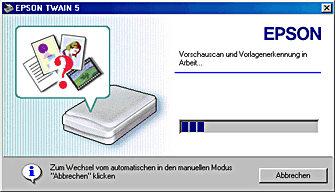 ![]() | Das folgende Fenster erscheint mit einem Statusbalken, der den Fortschritt des Scanvorgangs anzeigt. Sie können die Art der gescannten Vorlage sehen. Wenn Sie mehrere Fotos scannen, wird Ihnen darüber hinaus die Anzahl der gescannten Bilder angezeigt. |
