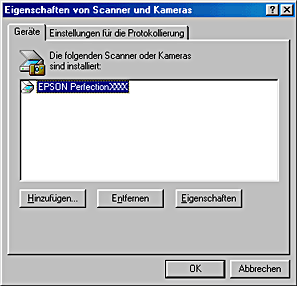 Wenn EPSON TWAIN installiert ist, erscheint das Symbol Scanner und Kameras in der Systemsteuerung. Ihr Scanner wird, wie nachfolgend dargestellt, in dem Dialogfeld Scanner- und Kameraeigenschaften aufgeführt.