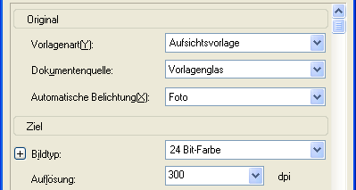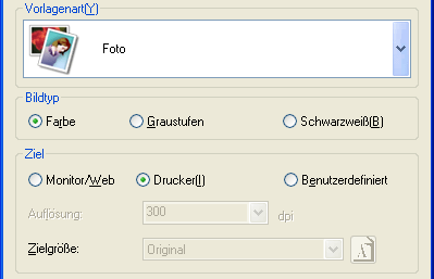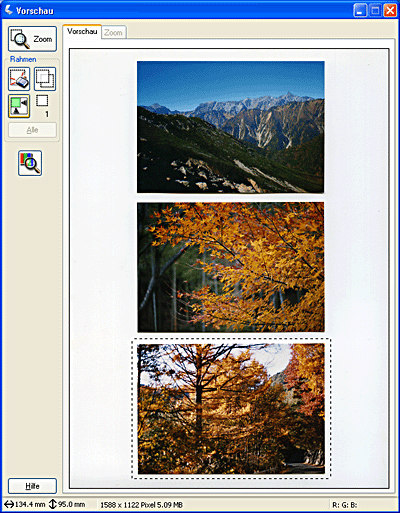 Wenn die Ausgabegröße des gescannten Bildes bereits feststeht, wählen Sie eine entsprechende Einstellung aus dem Listenfeld Zielgröße aus. Ein Rahmen proportional zu den Maßen für die Zielgröße wird im Vorschaufenster angezeigt. Sie können diesen Rahmen über den Bildbereich, den Sie scannen möchten, verschieben. Nähere Informationen finden Sie in der Online-Hilfe.