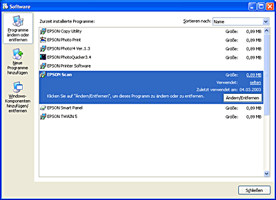 ![]() | Wählen Sie EPSON Scan aus der Liste und klicken Sie auf Ändern/Entfernen (Windows XP und 2000) bzw. Hinzufügen/Entfernen (Windows Me und 98). |