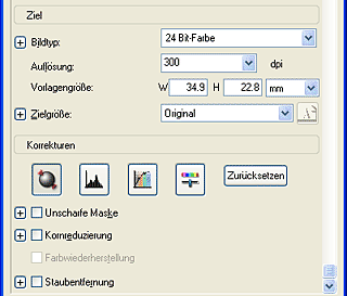 ![]() | Legen Sie über die Einstellung "Zielgröße" die Ausgabegröße für das gescannte Bild fest. Nehmen Sie bei Bedarf auch Einstellungen im Auswahlbereich "Korrekturen" vor. Näheres finden Sie unter Ansprechende Reproduktionen erstellen. (Möglicherweise müssen Sie im Dialogfeld ganz nach unten scrollen.) |