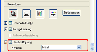 Das Ergebnis der Staubentfernung ist im Vorschaubild nicht erkennbar. Überprüfen Sie das Ergebnis im gescannten Bild.