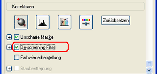 Aktivieren Sie das Kontrollkästchen Rasterungsfilter im Abschnitt "Korrekturen" (möglicherweise müssen Sie im Bildschirm ganz nach unten scrollen). Rufen Sie im Standardmodus zuerst das Dialogfeld auf Bildeinstellung, um zum Kontrollkästchen De-screening-Filter zu gelangen.