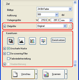 Wählen Sie die Ausgabegröße des Scanbereichs im Listenfeld "Zielgröße" aus und nehmen Sie bei Bedarf Einstellungen im Auswahlbereich "Korrekturen" vor. (Möglicherweise müssen Sie im Dialogfeld ganz nach unten scrollen.)
