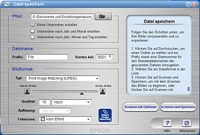 Einstellungen für Speicherort, Dateiname und Bildformat angeben. Für Bildformat wählen Sie Print Image Matching II (JPEG) oder Print Image Matching II (TIFF) aus der Liste mit den angezeigten Formaten.