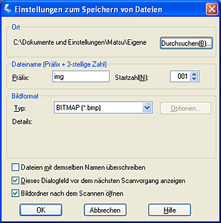 ![]() | Das Dialogfeld Einstellungen zum Speichern von Dateien wird angezeigt. Geben Sie an, wo die gescannten Bilder gespeichert werden sollen. Wenn Sie den Standardordner ändern möchten, klicken Sie auf Durchsuchen (Windows) bzw. Auswählen (Macintosh) und wählen Sie den gewünschten Ordner aus. |