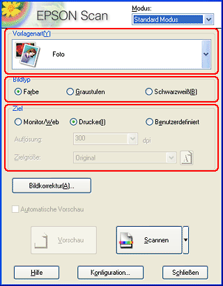 ![]() | Geben Sie im Hauptfenster von EPSON Scan Vorlagenart, Bildtyp und Ziel an. |