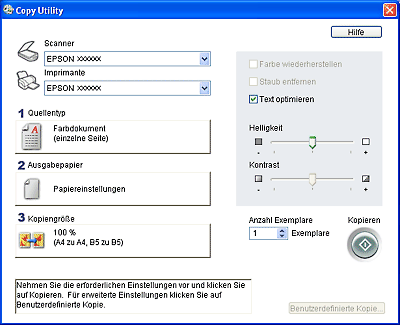 Dieses Programm verwandelt Ihren Scanner in einen Digitalkopierer mit Funktionen, die weit leistungsfähiger und flexibler sind, als die eines konventionellen Kopiergerätes. Mit dieser Anwendung können Sie Bilder scannen und als Fotos ausdrucken. Sie können in einer Vielzahl von Formaten drucken oder mehrere Fotos auf derselben Seite platzieren. Vor dem Ausdrucken ist die Ansicht der Effekte von Bildanpassungen im Vorschaufenster möglich. Wenn Sie diese Anwendung starten, erscheint das folgende Fenster.