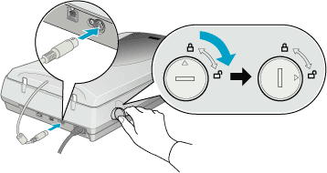 Vergewissern Sie sich vor dem Einschalten des Scanners, dass der integrierte Durchlichtaufsatz installiert ist und die Transportsicherung sich in der entriegelten Position befindet.