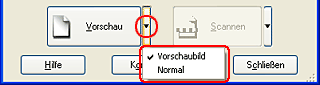 Durch Klicken auf Vorschau wird der Vorschauscan gestartet und das Bild in der Vorschau angezeigt. Abhängig vom Modus und der Einstellung für Dokumententyp erscheint ein kleiner Pfeil rechts neben der Schaltfläche Vorschau, über den Sie eine Vorschau-Methode wählen können. Klicken Sie auf den Pfeil und wählen Sie Vorschaubild oder Normal, um die Vorschau-Methode umzuschalten.