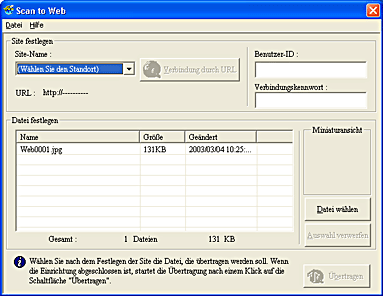 Verwenden Sie diese Anwendung, um ein Bild mit Hilfe von PRINT Image Matching zu scannen und es dann auf die EPSON-Website zur gemeinsamen Nutzung von Fotos zu übertragen. Wenn Sie diese Anwendung starten, wird das Bild von EPSON Scan gescannt und im Dialogfeld Verify Assistant angezeigt. Klicken Sie auf Weiter, dann wird das folgende Dialogfeld angezeigt. Klicken Sie auf Übertragen, um das Bild hochzuladen.